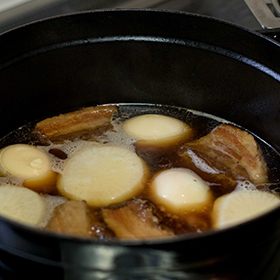 A l’aide d’une plaque presser la viande pour bien lui donner une forme rectangle, la couper en gros morceaux de 6 cm de large, puis la disposer dans une cocote à fond épais. Ajouter la sauce sojas, le mirin, le sake, l’eau, le sucre, et le gingembre coupé en fines lamelles. Couvrir et laisser mijoter 45 min. Pendant ce temps cuire les œufs durs, éplucher les oignons et le daikon. Laisser les oignons entiers, couper le daikon en tranche de 2 cm d’épaisseur, et biseauter légèrement les bords.