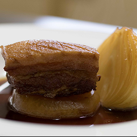 Dans une poêle sur feu vif mettre l’huile à chauffer, et bien dorer sur toutes les faces la poitrine de porc, débarrasser dans une casserole d’eau bouillante pendant 30 s pour dégraisser.
