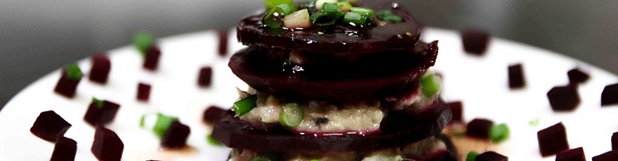 Découper les betteraves en lamelles de 3 mm d’épaisseurs, puis monter comme un millefeuille avec la crème de thon. Si il vous reste de la betterave, décorer l’assiette avec suivant votre inspiration, arroser de vinaigrette.