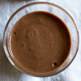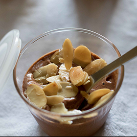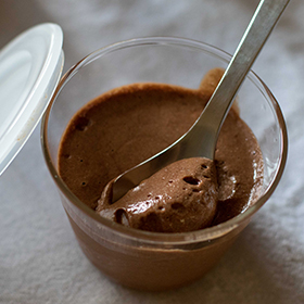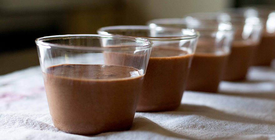 Ensuite ajouter peu à peu cette préparation à la ganache à l’aide d’une maryse. Verser la mousse dans un entonnoir à piston, ou bien dans une poche munie d’une douille lisse, et remplir des coupes à dessert (verrine, verre, bol…), laisser reposer une nuit au frigo.