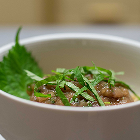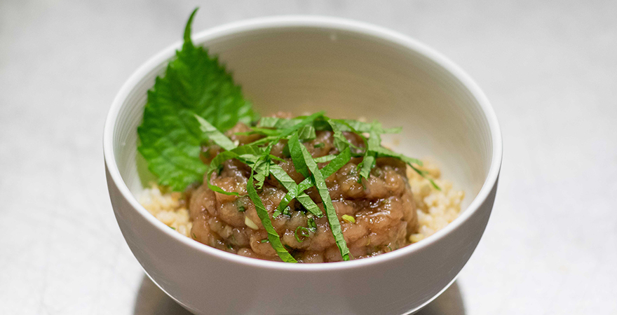 Cuire le riz, et servir dans 4 grands bols, recouvrir du mélange thon/ciboulette, et arroser de sauce. Ciseler finement les feuilles de shiso et mettre sur le dessus.